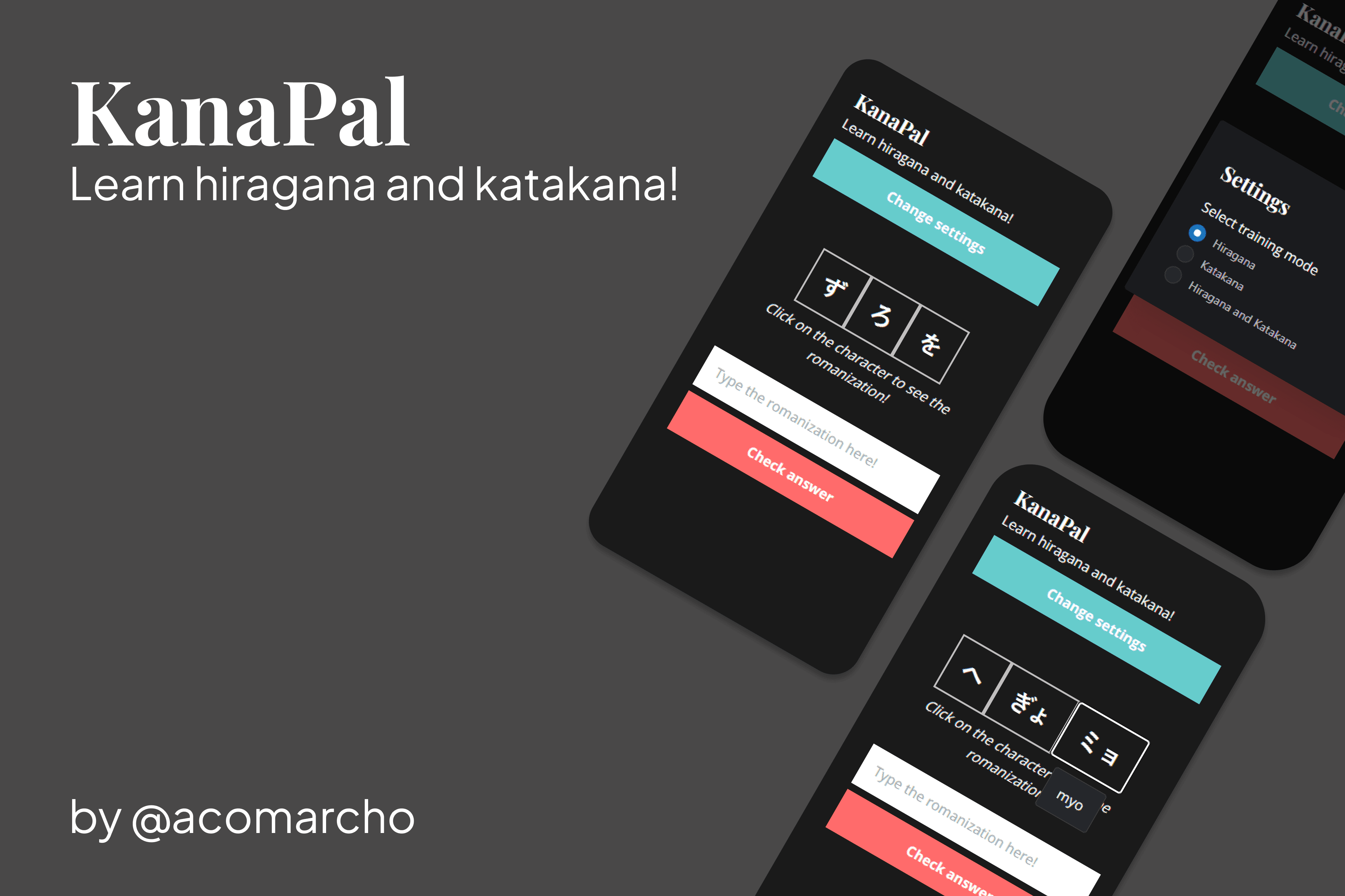 KanaPal is a project I made to help me when I was learning Japanese. It's made in Next (TypeScript), and all the logic is done in the frontend. This project allows people to learn hiragana and katakana easily.